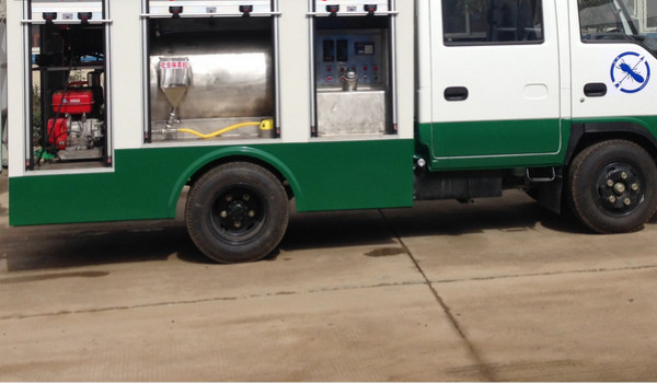衛(wèi)生防疫車是一種可通過電腦來控制藥物的兌比濃度、并可自動灌裝,攪拌的新型白蟻防治車。其特點是此白蟻防治車上有配藥系統(tǒng),噴藥系統(tǒng),攪拌系統(tǒng)及清洗系統(tǒng)。此車上配有兩個罐體,采用上下疊加式連接,上部罐體為清水箱,下部罐體為配藥箱。在罐體前部另外配有單獨的藥箱(液體藥物),藥箱上部安裝電腦控制系統(tǒng),后部安裝加藥機(jī),另在整車后部安裝有高壓泵及卷盤。配藥時只需按所需的比例在電腦上輸入所需要的加水量及加藥量即可自動配藥。當(dāng)藥物通過加藥機(jī)輸入到配藥箱后,即可啟動車輛的攪拌系統(tǒng)。另外此車輛還單獨配有粉狀藥物灌裝到配藥箱的功能,只需將粉狀藥物倒入其單獨設(shè)置的投料口即可操作配藥。