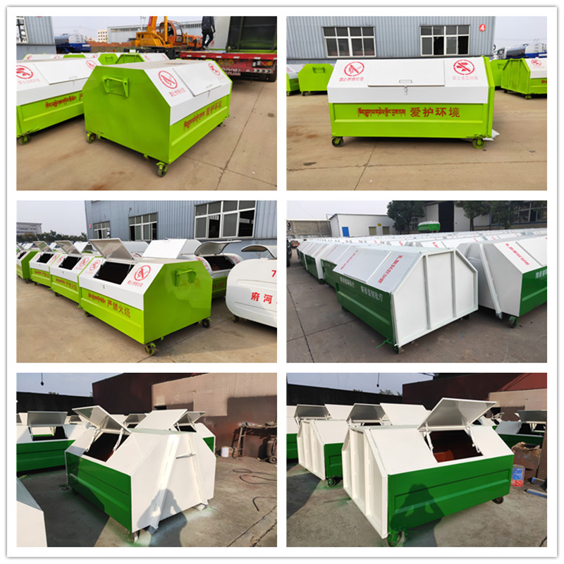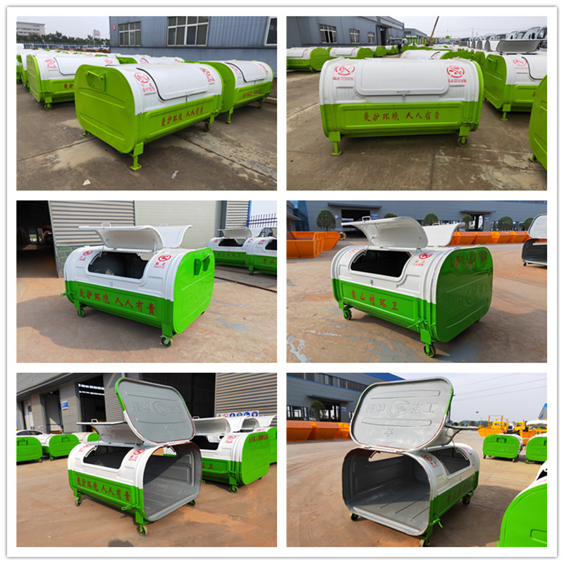 勾臂垃圾車配套移動垃圾箱外形以上梯形下長方形、上弧形下長方形、上弧形下弧形、長方形為主,箱體兩邊各帶一對或二對垃圾投入口或頂部開口,帶蓋式箱體能夠避免風(fēng)將輕質(zhì)垃圾(塑料袋,廢紙等)吹散和防止雨水進(jìn)入箱內(nèi);箱體底部帶一對鐵輪方便吊上卸下時垃圾箱的移動,箱體后部可開啟【帶鎖緊機構(gòu),配備密封條】。勾臂垃圾箱外觀形狀、大小容積可根據(jù)用戶需求定制加工。