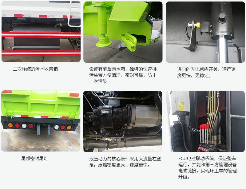 上裝配置:廂體圓弧設(shè)計(jì)(增強(qiáng)廂體承受力),Q345錳鋼板(高強(qiáng)度耐磨抗壓材質(zhì),罐體試用壽命更長),前后雙向壓縮,推鏟卸料,長源液壓泵,中梅多路換向閥,維森博樂油缸,高耐壓液壓油管,西門子PLC一鍵操作系統(tǒng)(駕駛室內(nèi)外均可操作),移動(dòng)遙控器控制箱體操作,雙污水箱(前后各一個(gè)),邊燈,高位示廓燈,夜間作業(yè)燈。